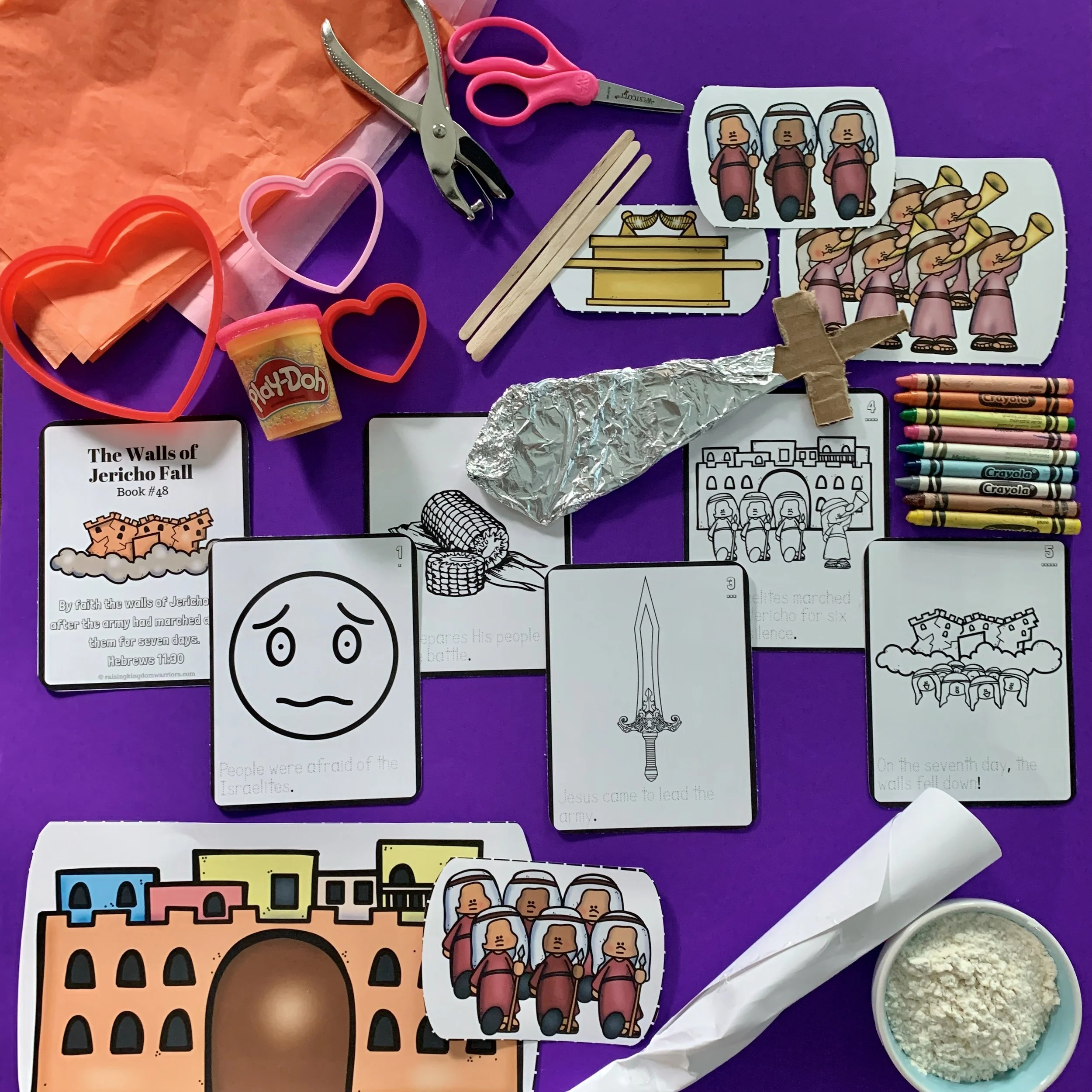 Day 2: Get crafty as you discuss the three ways God prepared His people to rely on Him before go into battle. Cut away sin (with play dough), celebrate (with hole-punch confetti), and feast (with fruit of the Promised Land.)