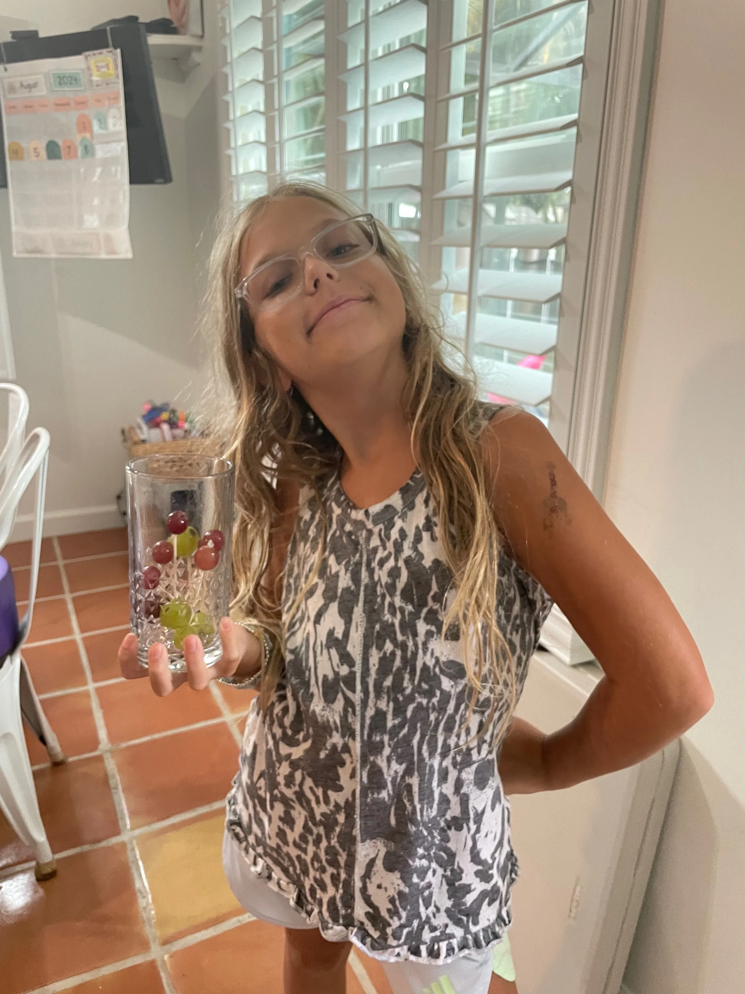 Lily served her dad a glass of “H2O” made with toothpicks and grapes.